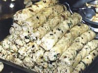 ⑷、案板撒干粉后放上醒好的面团,擀成宽约80厘米、宽约40厘米、厚约0.4厘米的长方形面皮。皮子上均匀的涂上肉酱后, 再铺上豆腐干等馅料,然后从一头卷向另一头,卷成长圆筒形,再用双手挤捏成直径约为5厘米的长圆条形,用刀每隔10厘米切下一段,成为50个煎卷生坯。