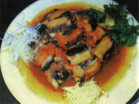【特点】1. 河鳗生长栖息于河港中石隙间,要用钓捕,故数量不多,泉州市晋江下游有一小支流圆通港,这里所产河鳗耳鳍乌黑,称乌耳鳗,体圆而肥,味鲜质细,质地尤佳。 2. 本品为闽南名菜,制作巧妙,采用了脱骨的高超技艺,使食客不被鱼刺所干扰,人口酥软甘醇。
