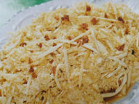 3、炒锅旺火烧热,下猪油100克烧到八成热时,倒下拌匀的笋丝鸡茸糊,这时火越旺越好,炒三分钟后装盘,再撒上火腿即成。