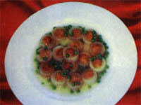 2. 炒锅置中火,倒入干贝汁100克及蒸汁煮沸,加精盐、味精调匀,起锅徐徐淋于"扳指干贝"上即成。
