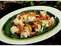 3、花油10克,料酒、香油、高汤、精盐、味精以及香菇、冬笋、葱片稍炒,倒入过油虾,快速颠炒均匀装盘即可。