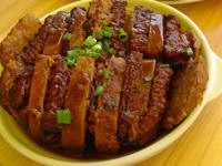 2、锅上火,倒入清油,烧至八成热,将五花肉皮朝下放入锅中炸至呈深红色,捞出晾凉,皮朝下放在砧板上,切成7厘米长、2厘米厚的大片,中要把皮切断;将肉皮朝下整齐地码在碗内,肉上放梅干菜,均匀倒入酱油,入蒸锅蒸约30分钟至肉软烂,取出扣在盘于里。