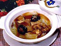 3、锅中留底油,放蒜茸、葱段、姜花、油鸭、白菜块,加汤、盐、味精、蚝油、香油、胡椒粉、水淀粉,点明油放在煲中,褒至白菜透明入味即可。