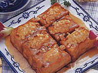 3、在每块豆腐中间挖一个长2.5公分、宽1.5公分、宽1.5公分的小洞,然后每块豆腐瓤入肉馅20克 4. 炒锅用中火烧热,下油25克,把瓤豆腐逐块放入,边煎边加油二次(每次约25克),煎至两面金黄色,取出入入砂锅,加入二汤、精盐、味精,加盖,用中火焖2分钟至熟,下酱油调色,用湿淀粉勾芡,淋油25克拌勾碟,撒目葱、左口鱼末、胡椒粉便成。