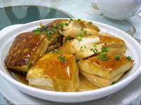 1、豆腐切成5厘米长、3厘米宽、0.7厘米厚的片。猪肉切片。青蒜洗干净后切成短节。豆瓣酱剁成细末,锅内油烧至六成熟,将豆腐逐片放入,两面煎黄铲出;