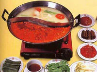 2、牛油75克烧至六成熟,放豆瓣炒酥,加姜末、辣椒、花椒炒香,加牛肉汤烧沸,放料酒、豆豉,醪糟汁烧沸成火锅卤汁;