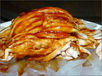 3、用红油辣椒、酱油、白糖、芝麻酱、味精、花椒面、芝麻油,调成味汁,淋在鸡丝上即成。