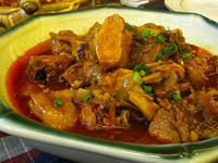2. 炒锅置旺火上,下菜油烧至七成热,放入鸡块,姜,煸炒约2分钟,加川盐,葱花,稍煸炒后,加入酱油,肉汤;