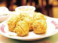 将偏口鱼肉洗净,与肥肉膘一起剁成细泥,放碗中加精盐、绍酒、芝麻油、湿淀粉、鸡蛋清、葱、姜末、清水搅匀成鱼泥。芝麻放在锅中偏炒至熟,把鱼泥料挤成直径1.2厘米的丸子,周身上沾芝麻:炒锅内加花生油,中火烧至六成热(约150℃)时,将鱼丸逐个放入油内炸熟,呈金黄色时捞出,摆入盘中即成。