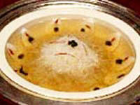 燕窝色白如雪,鸽蛋形似柳叶,汤清澈晶莹,口味鲜醇。