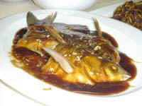 3、少量汤加酱油、料酒和姜末调味后捞出鱼装盘,余汤加白糖、湿淀粉和醋搅成浓汁,滚沸起泡,徐徐浇在鱼身上即可.