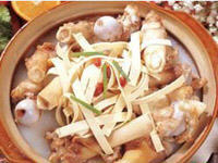 主料:熟鸡肉50克、鲜河虾50克、肉丸6颗、鱼圆6颗、猪肚50克。 辅料:熟火腿15克、熟蛋糕25克、水发肉皮100克、水发粉丝100克、熟笋肉25克、大白菜250克。精盐7克、味精5克、清汤750克。熟猪油50克。