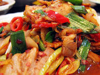 精选肥瘦相连的带皮猪腿肉,入锅煮至皮软肉熟,捞出晾凉后切成长5厘米、宽4厘米、厚3毫米的片。炒锅置旺火上,放油烧至120℃,下肉片略炒,再加适量精盐炒出油,待肉片四周微卷,形呈灯盏窝状时,用剁碎的郫县豆瓣再炒上色,投入适量的甜面酱、红酱油、潼川豆豉及蒜苗段炒出香味即成。