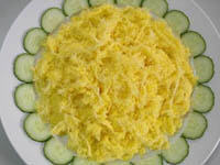 2.锅中加油烧至4成热(油多些),手握细眼筛子对准油锅,四面均匀的淋入打匀的蛋液,使之逐渐淋入油中受热成丝并浮起时,用筷把它翻过来,略松一下捞出,放在小箩中尽量压干油份。